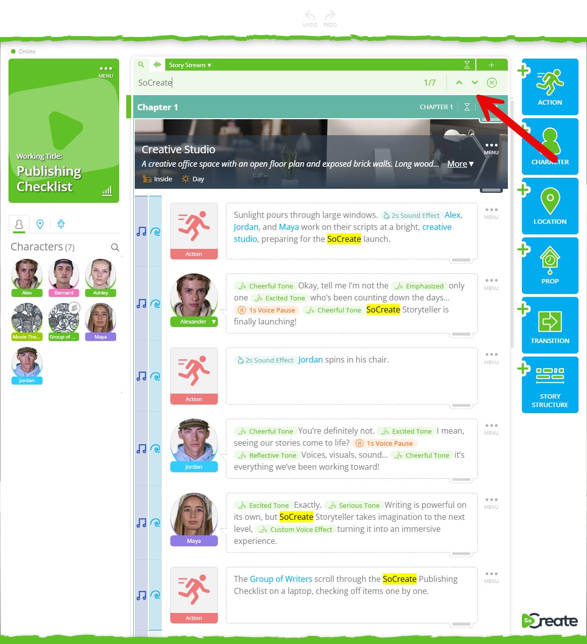 Now, you can search your entire project for any word or phrase. To make it even better, collapse your scenes using the collapse all scenes feature in the top green bar, and then search for what you are trying to find. When your scenes are collapsed, and you search for something, SoCreate will automatically expand only the scenes that contain your search term.
