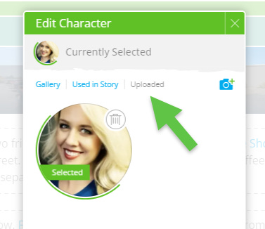 Extra Credit: Use your own images for your Characters, Location, and Title Card! Find images for these Stream Items online, or create your own by hand or digitally to craft exactly what’s in your imagination. Then, hover over the item for which you wish to upload your own image. Using the three-dot menu icon, bring up the item’s Edit box, and click “Change Image” then the “Uploaded” tab. From here, you can add as many of your own images as you’d like. Select the final image you want to use and click “Save.” Your uploaded image will now appear in your Story Stream for the item for which you’ve added it.